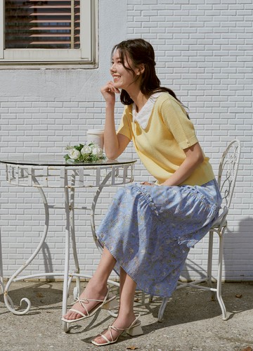 淺粉黃客製剪花梭織半身裙多層荷葉邊
