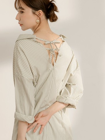 條紋收腰打褶美背綁帶長袖襯衫