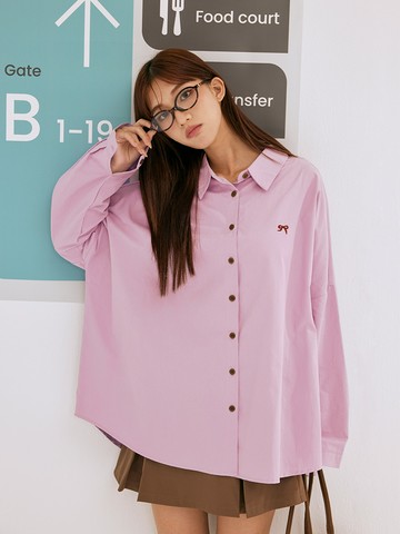 純棉撞色排釦蝴蝶結刺繡寬鬆襯衫