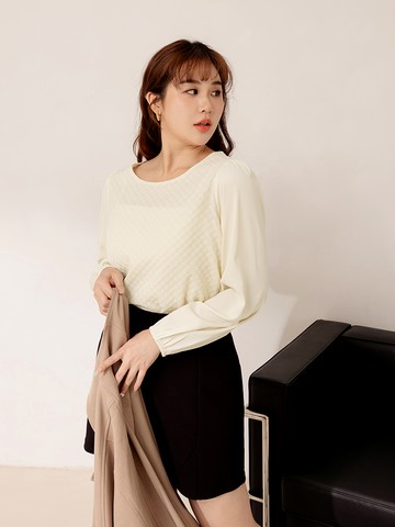 立體菱格緹花抽繩下襬長袖上衣