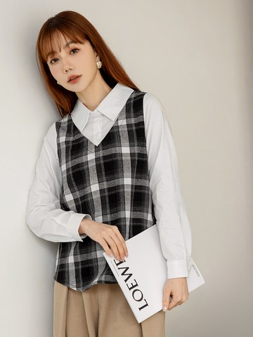 格紋荷葉邊V領開襟襯衫(0S000013000) - earth music&ecology
