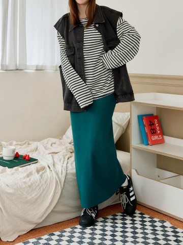 仿貂毛直紋開衩腰鬆緊長裙