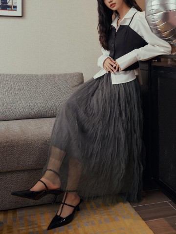 《小女人》美人魚深V蕾絲裸背連體衣搭透視網紗半身裙-星空黑