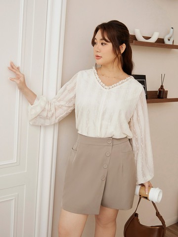 百葉造型領片車褶皺拋袖上衣