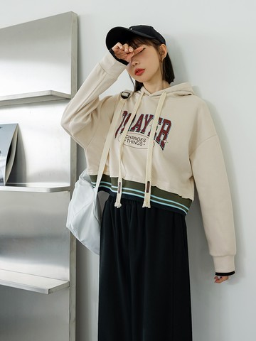 ➤條紋拼接造型袖抽繩大學T(兩色)