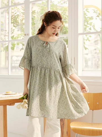 純棉大翻領鬆緊澎袖襯衫洋裝