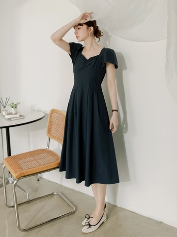 〚Green Parks〛褶皺拼接下擺法式袖洋裝