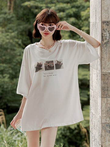 純棉墨鏡貓咪照片印花寬鬆上衣