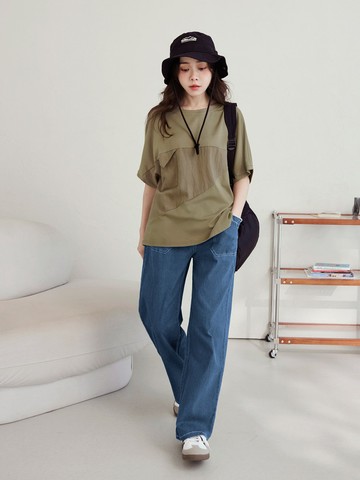 純棉素面反摺褲管直筒寬褲