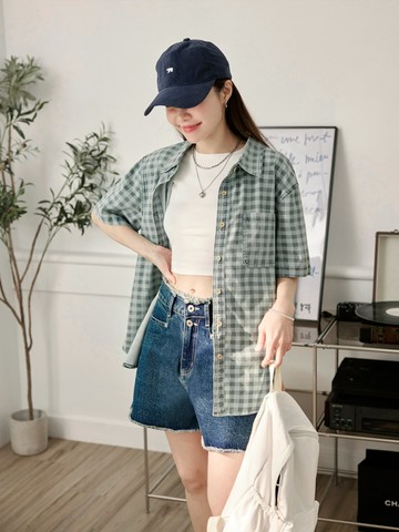 襯衫領短袖休閒上衣/淺綠色 | 5124641850