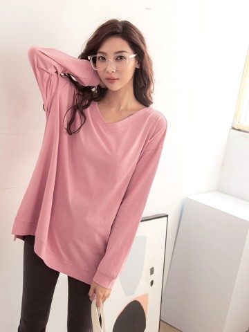 純棉不規則下襬袖拼接長袖上衣