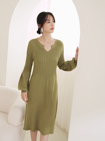 坑條針織V領排釦七分袖寬鬆洋裝