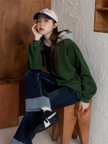 假兩件麻花織紋拼接連帽上衣