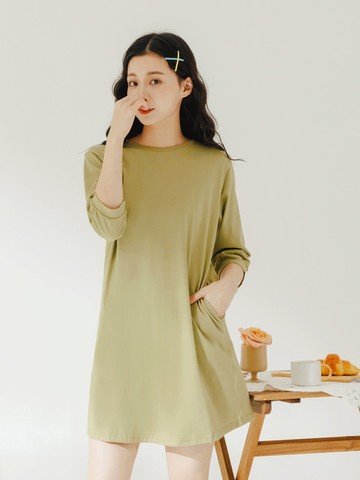 純色多色寬版圓領側開衩長袖洋裝