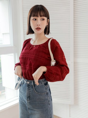 格紋抽皺織紋挖空內裡長袖上衣