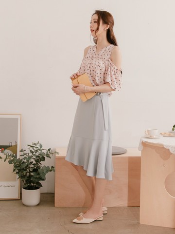 雲朵自訂款-小V臉.方領百褶拋袖碎花雪紡上衣