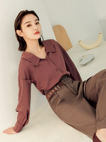 微光澤翻領開襟修身長版襯衫(附腰帶)
