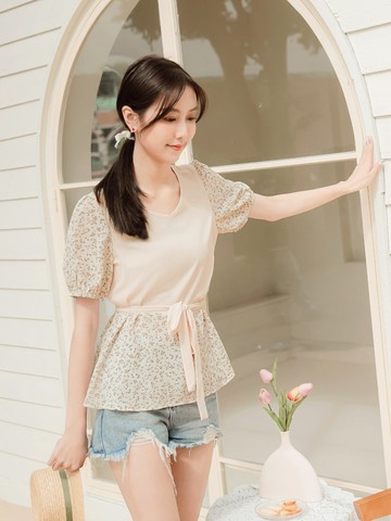 涼感.小V臉舒涼雪紡碎花上衣(附綁帶)