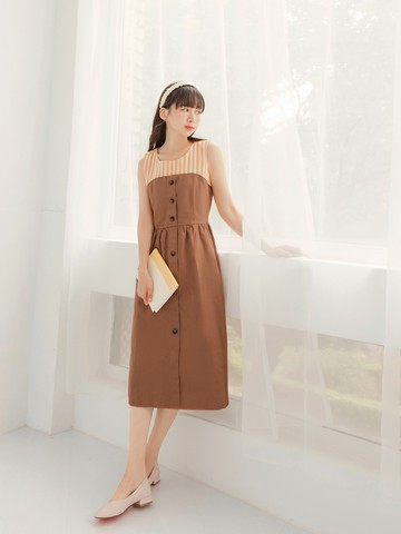 純棉條紋方領後綁帶背心洋裝