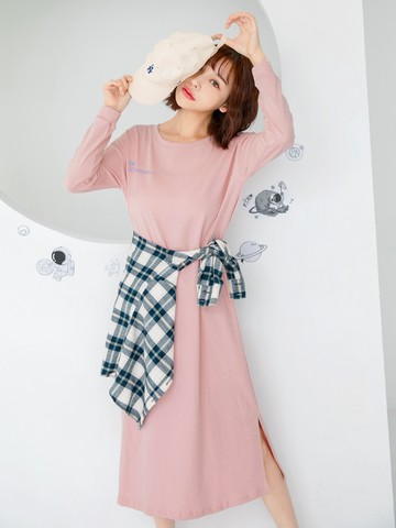 高含棉假兩件標語印花開衩中長洋裝