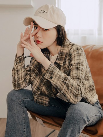 柔韌磨毛格紋時髦短版上衣/襯衫