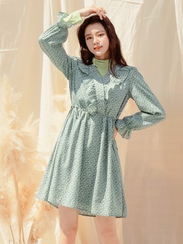 短袖排扣中山領設計洋裝_復古小花