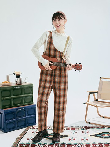 率性格紋拼接高含棉牛仔寬吊帶褲