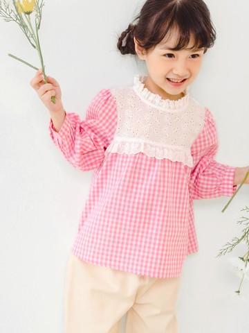 拼接異材質格紋領片可愛笑臉印圖純棉後開領上衣