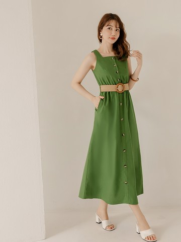 細肩帶背心皮革短洋裝 /橄欖綠