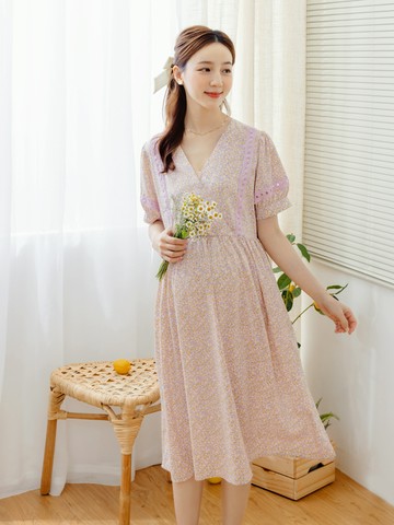 韓系格紋拼接袖拉鍊式哺乳孕婦洋裝