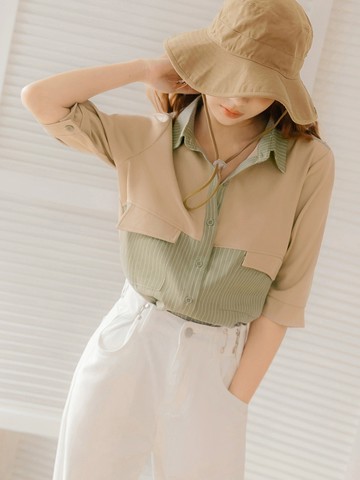 拼接襯衫 - 粉紅