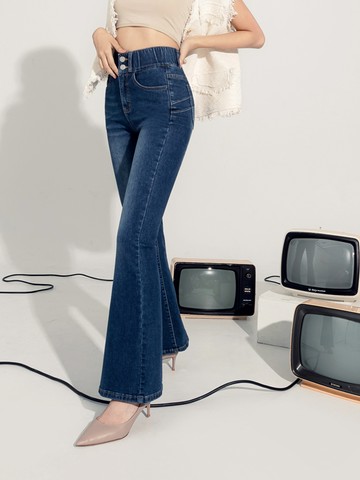 視覺細-5KG.鬆緊腰彈力炒鹽牛仔喇叭顯瘦褲