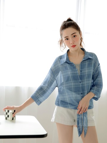 涼爽雪紡短版格紋綁帶長袖襯衫上衣