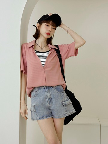 襯衫領短袖休閒上衣/淺綠色 | 5124641850