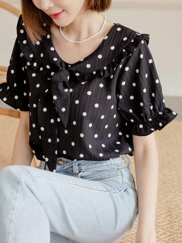 減齡 法式寬松 波點 娃娃領 長袖襯衫 韓少女慵懶