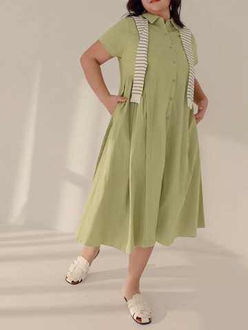 純棉大翻領鬆緊澎袖襯衫洋裝