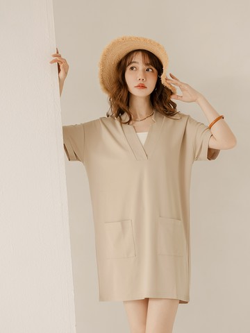簡約優雅 V領半袖洋裝 寬袖連身裙 極簡風格 下擺開衩H線修身
