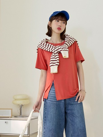 【Dailo】舒適條紋拼接短袖上衣 紅 米