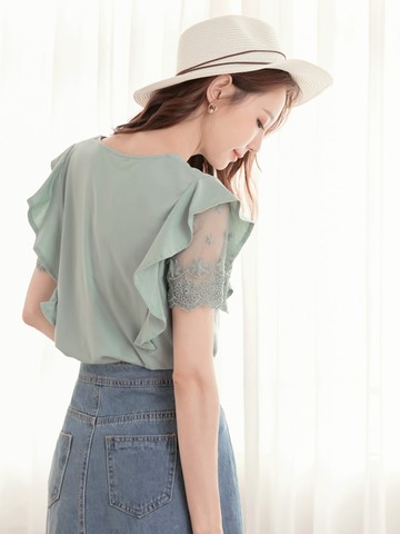 氣質立體網紗繡花方領澎袖上衣