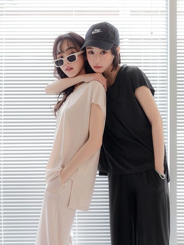 涼爽V領坑條長版開衩落肩上衣