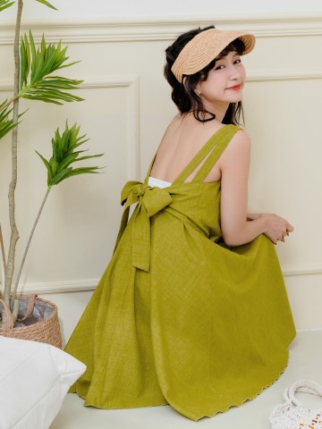 法式復古 夏日青草綠肩帶可調節棉質洋裝