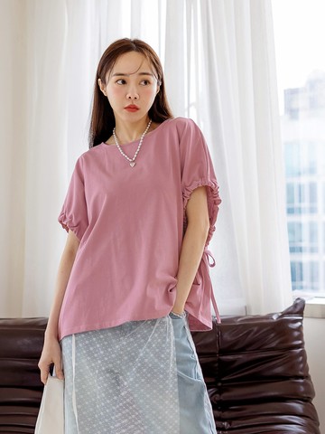 (L) gucci質感丹寧牛仔綁帶粉色短裙