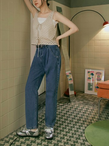 韓版復古高腰直筒垂感交叉牛仔褲【P187】