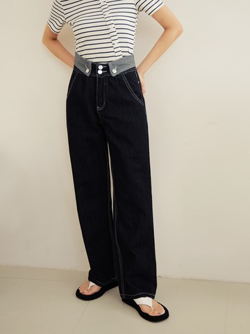 俐落壓褶後鬆緊腰設計直筒長褲(07000220200) - YECCA VECCA