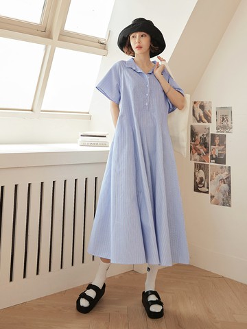 純棉大翻領鬆緊澎袖襯衫洋裝