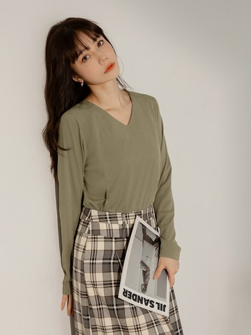 純色V領長袖傘襬寬鬆上衣