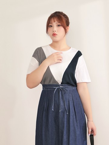 假兩件異材質配色拼接落肩袖上衣T
