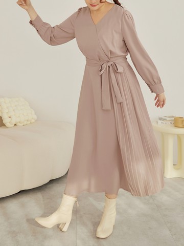 V領側邊百褶長袖後開收腰長洋裝(附綁帶)