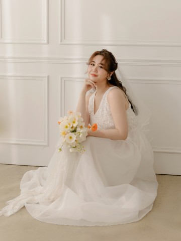 花葉蕾絲拼接V領無袖落地長襬輕婚紗