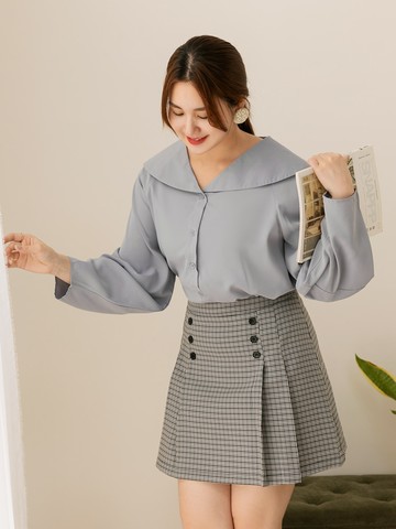 雲朵自訂款-小V臉.桃心領格紋拋袖上衣
